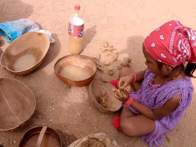 – Wayuunkeera (el juego con figuras escultóricas de barro): Es exclusivo de las niñas. Se trata de moldear con barro figuras escultóricas de la mujer, ya que, dentro de la sociedad wayuu, es sumamente importante porque es la madre y porque está asociada espiritualmente a la Madre Tierra. En las imágenes, se configuran valores como el respeto y el concepto de sacralidad de la vida. De ahí que la actitud y destreza de la mujer se integra en la práctica de oficios de carácter sagrado, tales como el arte del tejido, la fabricación de cerámica, el procedimiento de la medicina tradicional, el dominio del mundo onírico y la práctica de ritos y ceremonias mágicas y religiosas. Por eso es que la niña wayuu, por su género femenino, no está muy vinculada a los juegos, excepto en la práctica del moldeado de la wayuunkeera.